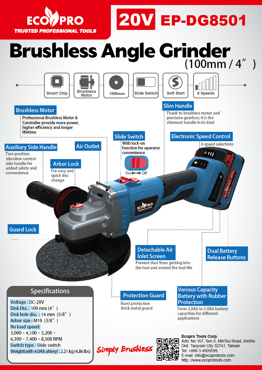 EP-DG8501Product name : 20V Brushless Angle Grinder (100mm / 4”)