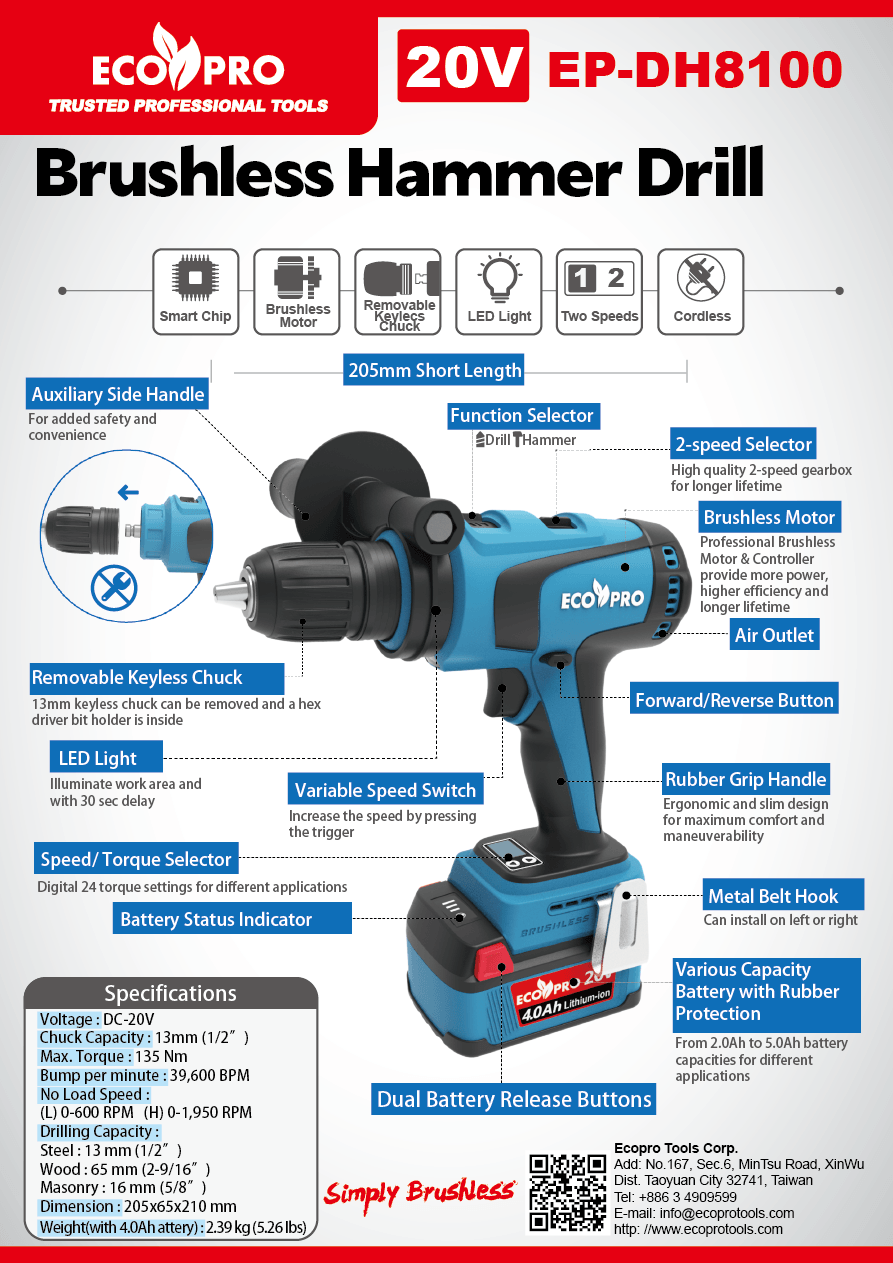 EP-DH8100Product name : 20V Brushless Hammer Drill