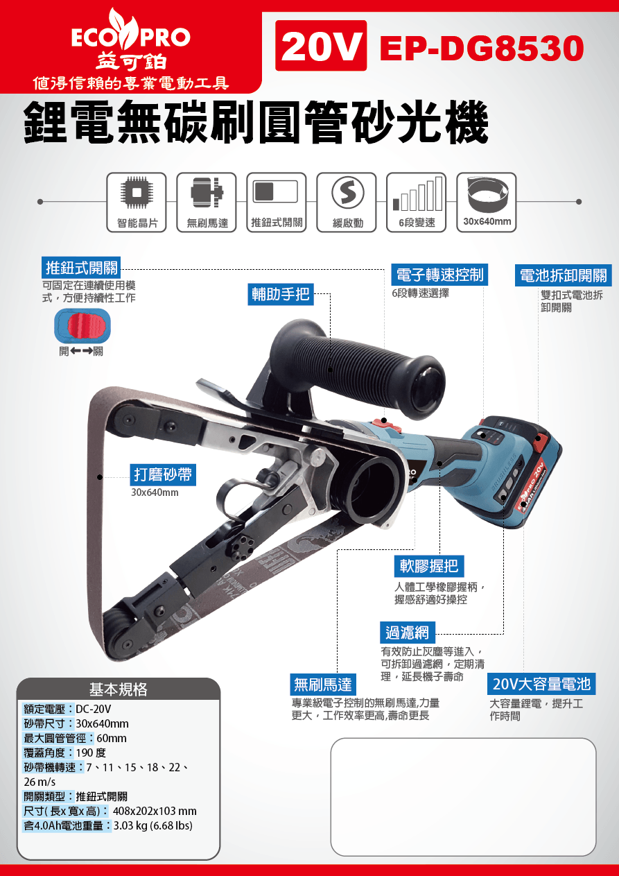 EP-DG8530商品名稱 : 20V 鋰電無碳刷圓管砂光機