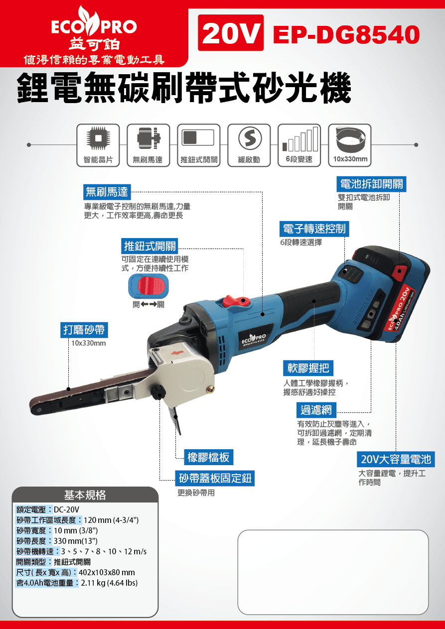 EP-DG8540商品名稱 : 20V 鋰電無碳刷帶式砂光機 (10x330mm)