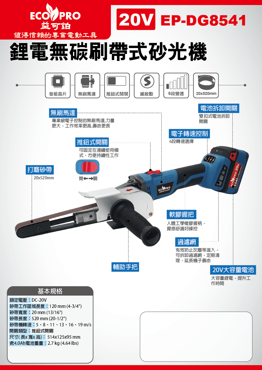 EP-DG8541商品名稱 : 20V 鋰電無碳刷帶式砂光機 (20x520mm)