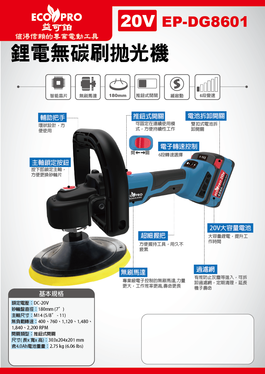 EP-DG8601商品名稱 : 20V 鋰電池無碳刷拋光機