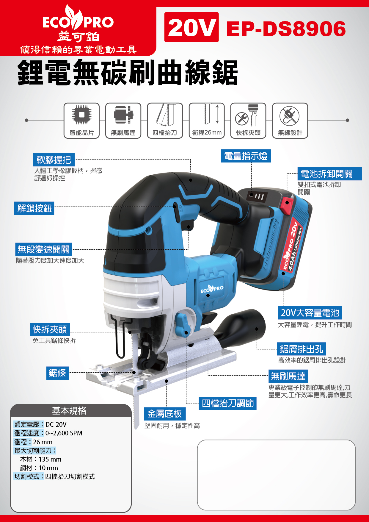 商品名稱 : 20V 鋰電無碳刷曲線鋸