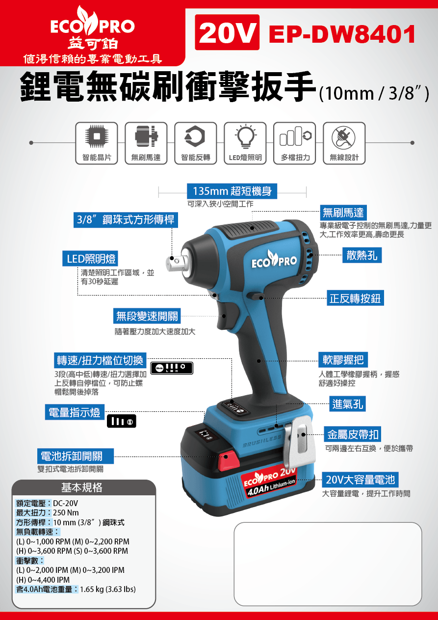 EP-DW8401商品名稱 : 20V 鋰電無碳刷衝擊扳手 (10mm / 3/8”)