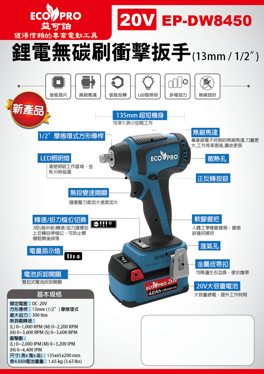 EP-DW8450商品名稱 : 20V 鋰電無碳刷衝擊扳手 (13mm / 1/2”)