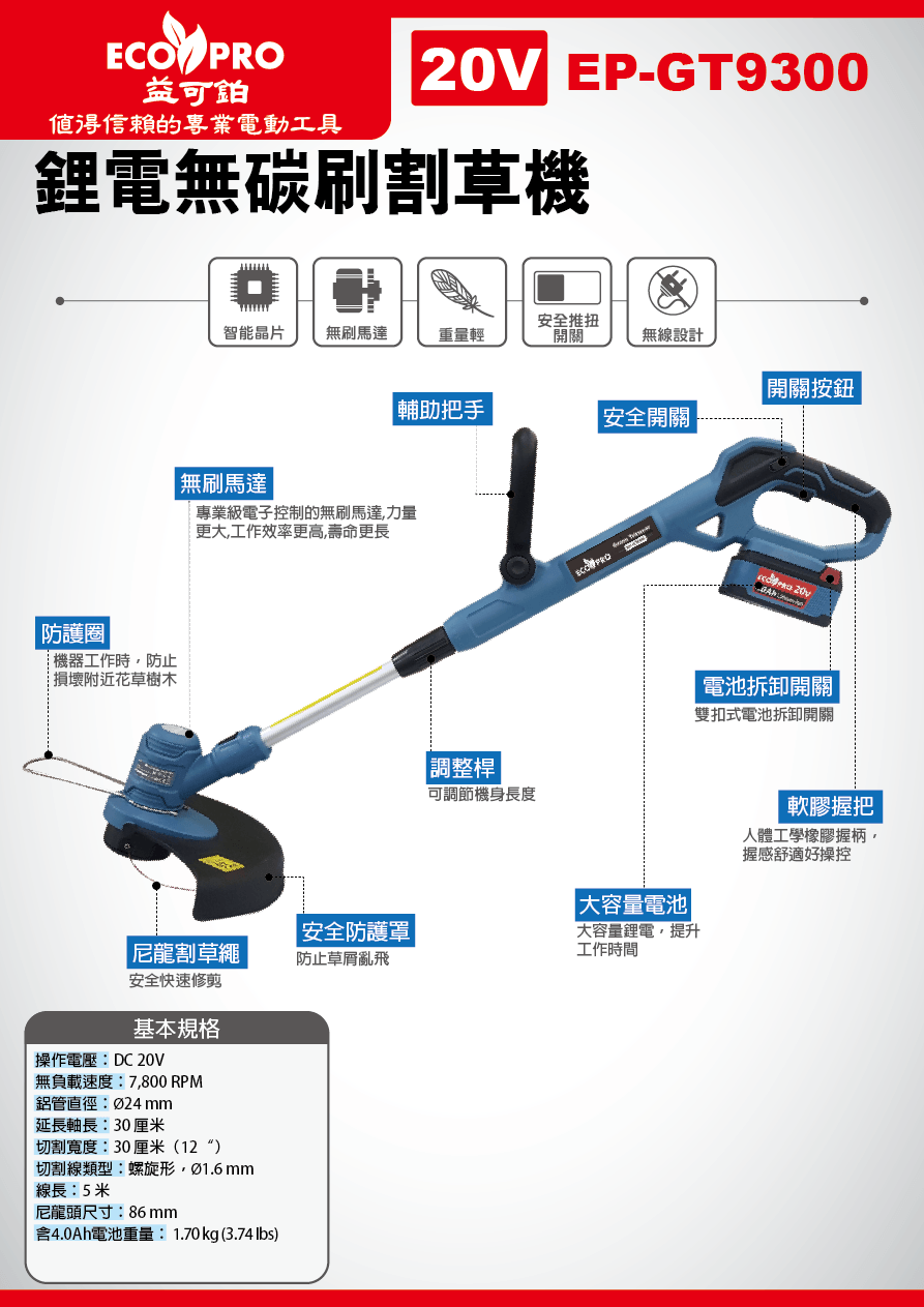 商品名稱 : 20V 鋰電無碳刷割草機