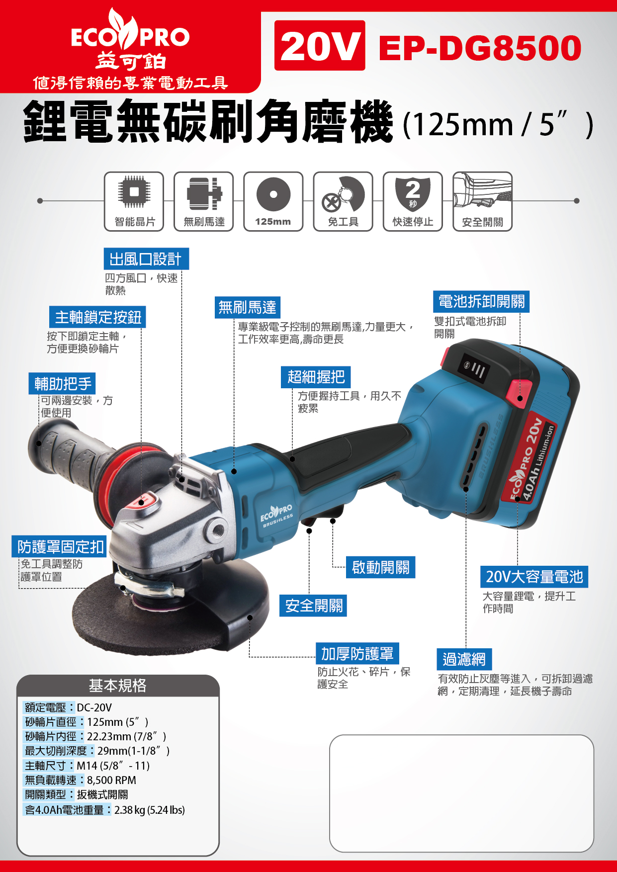 EP-DG8500商品名称 : 20V 锂电无碳刷角磨机 (125mm / 5”)