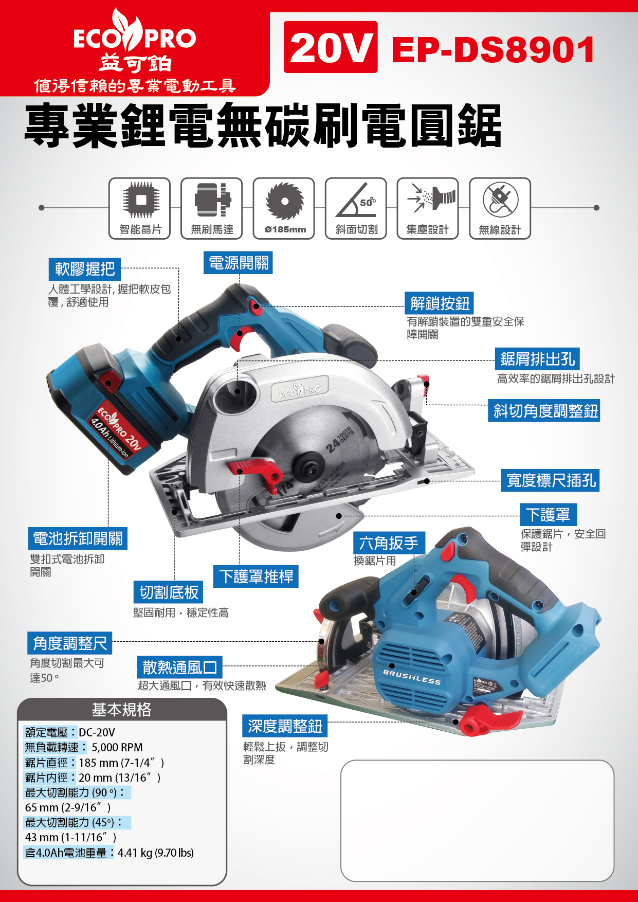 EP-DS8901商品名称 : 20V 专业锂电无碳刷电圆锯(185mm/7-1/4”)