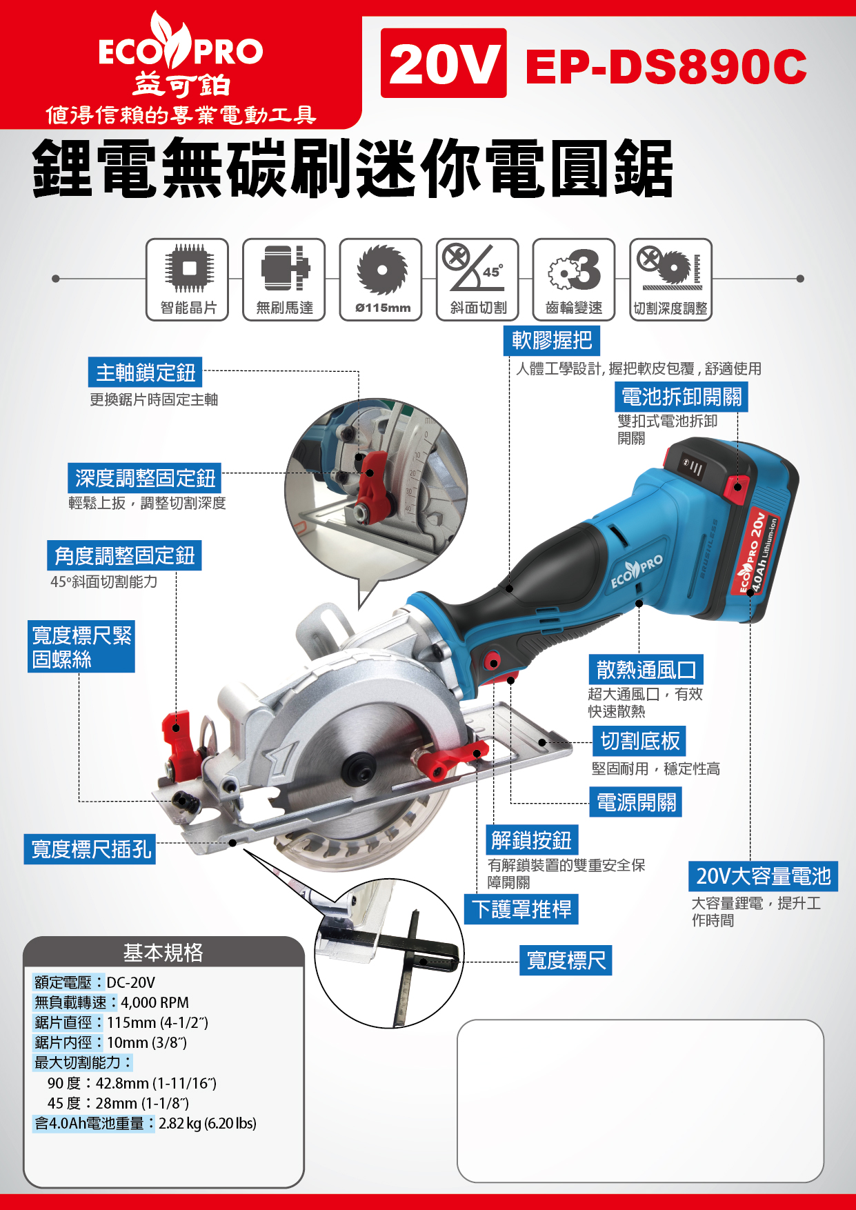EP-DS890C商品名称 : 20V 锂电无碳刷迷你电圆锯(115mm / 4-1/2’’ )